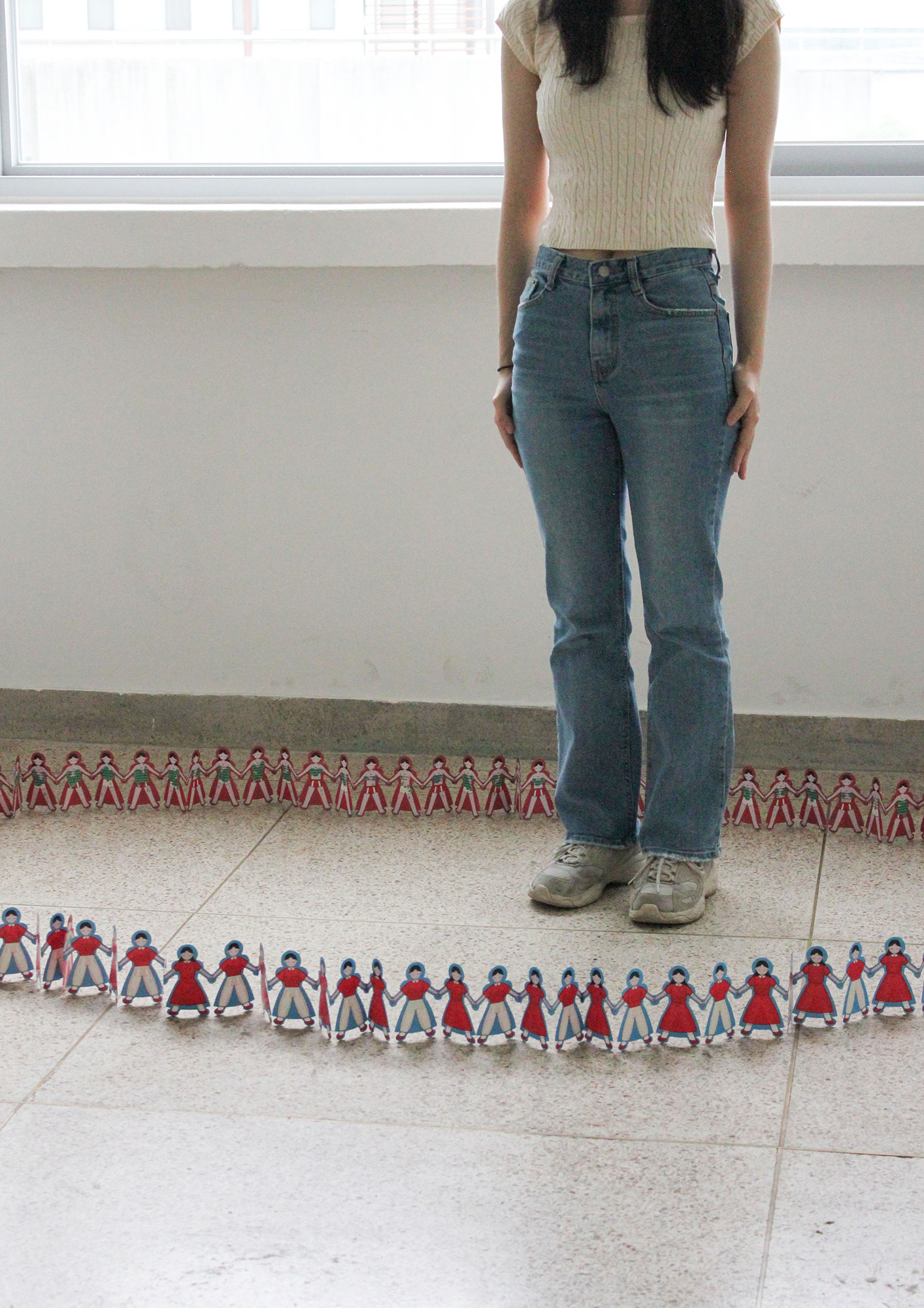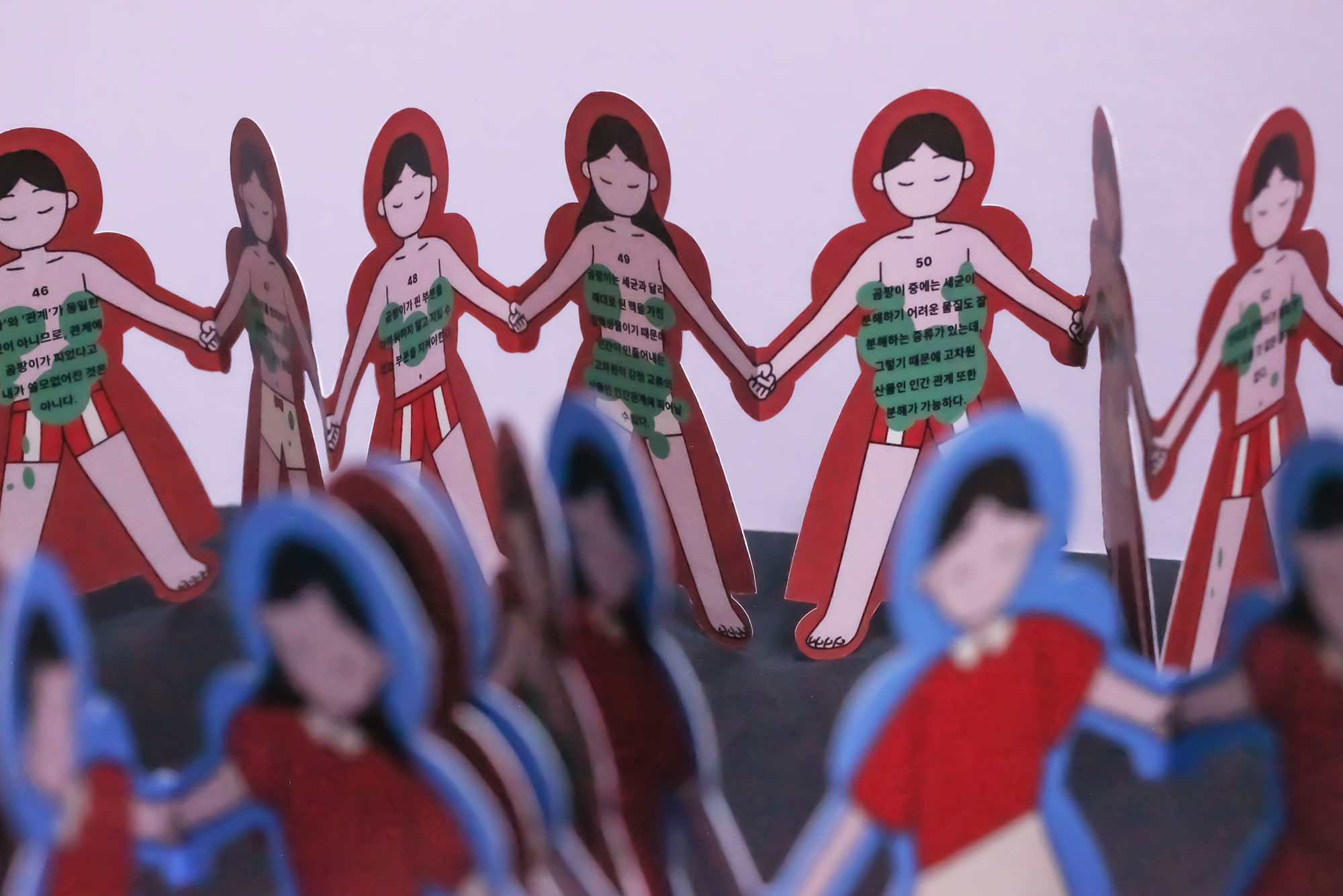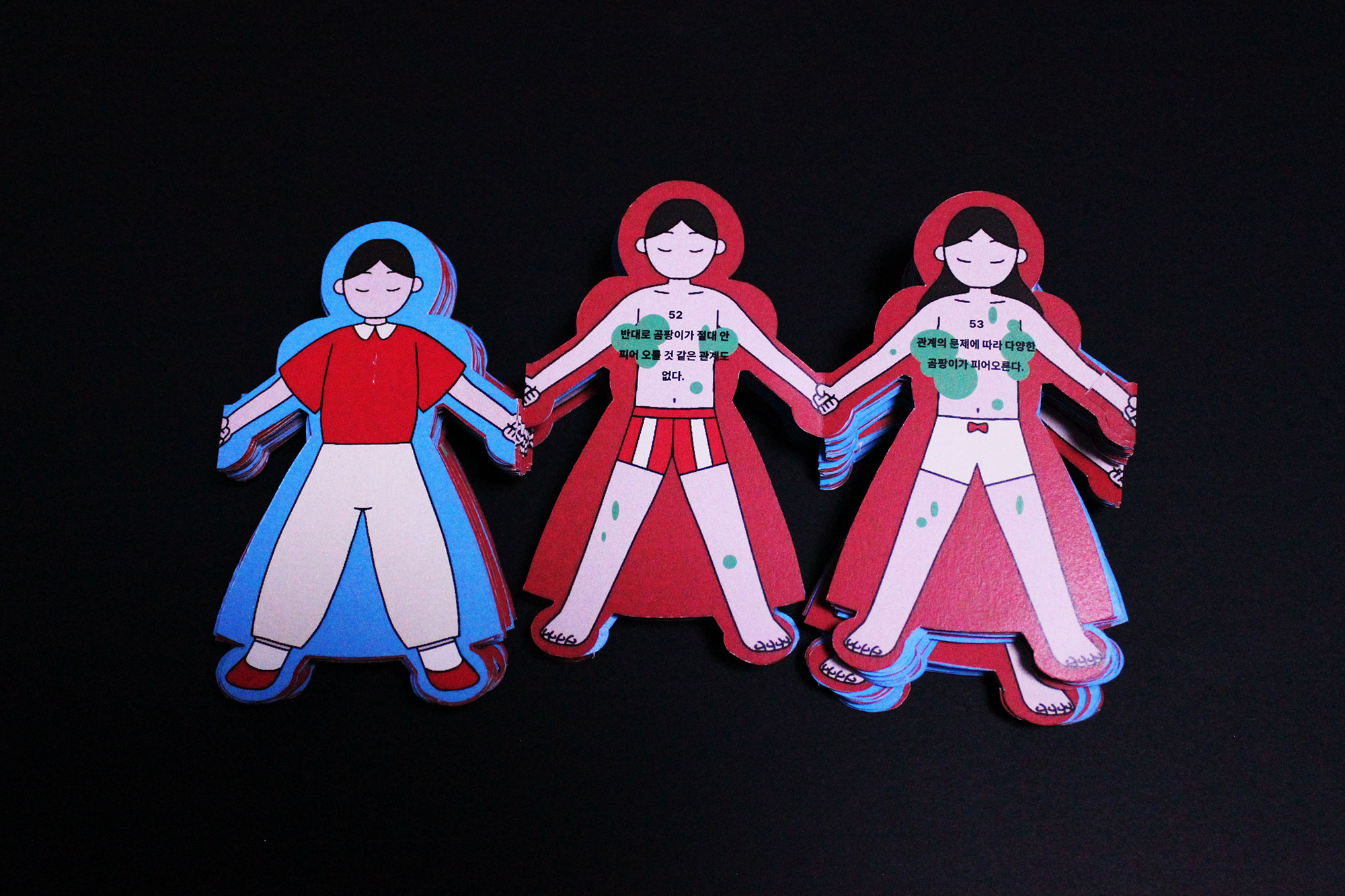 70*100 사이즈의 작은 크기는 마치 관계가 한 손에 들어오는 것 같은 느낌을 주지만 이를 펼치면 끝도 없이 펼쳐지며 7미터 이상의 장대한 길이가 되어 쉽게 통제할 수 있는 관계라고는 말할 수 없게 된다. 이 종이 인간 군집의 끝과 끝을 이어 원을 만들면 안과 밖의 구분이 생기면서, 비로소 관계의 속내를 볼 수 있게 된다. 오로지 멀쩡한 밖만을 보려고 한다면 무엇이 문제인지 알 수 없다. 진정한 사실을 알려면 그 안, 내부를 봐야만 알 수 있다. 각각의 종이 인간들은 곰팡이가 피듯 해로워지는 관계에 대한 특징과 이유들을 각각 하나씩 담고 있다. 그들은 어떤 이야기를 하고 있는가. 어떤 이유로 그들에게 곰팡이가 피어났는가.