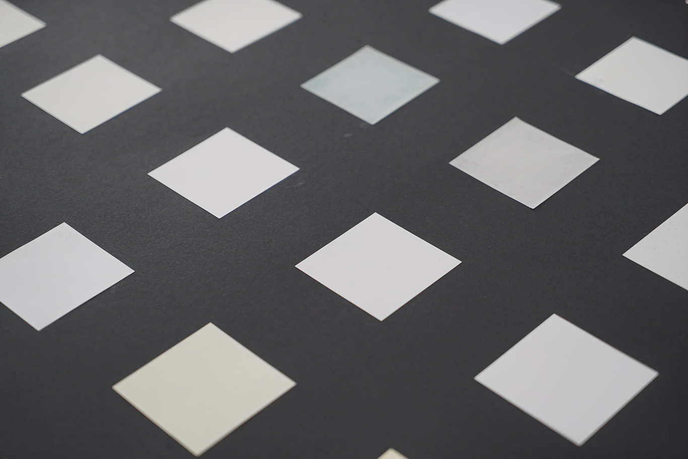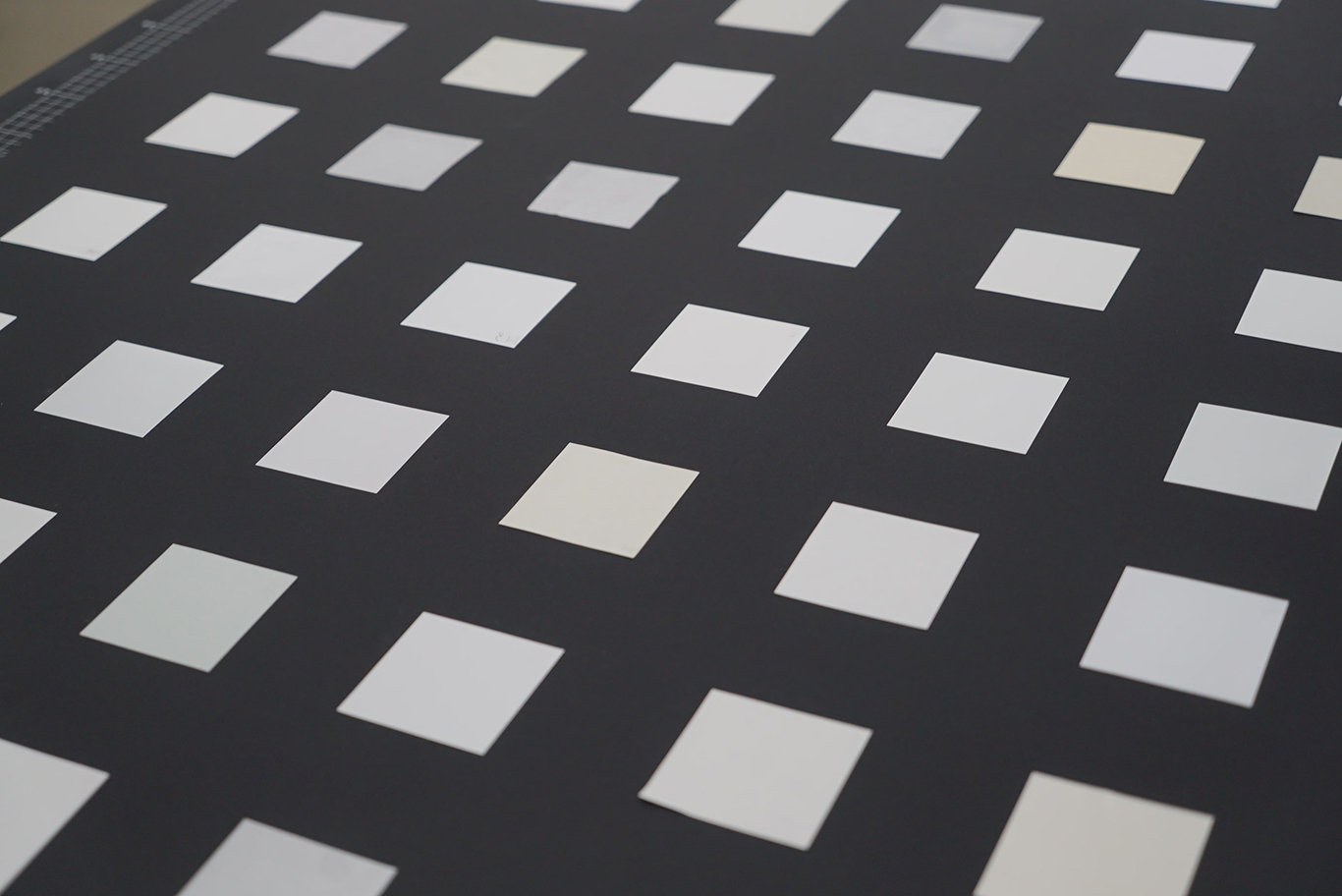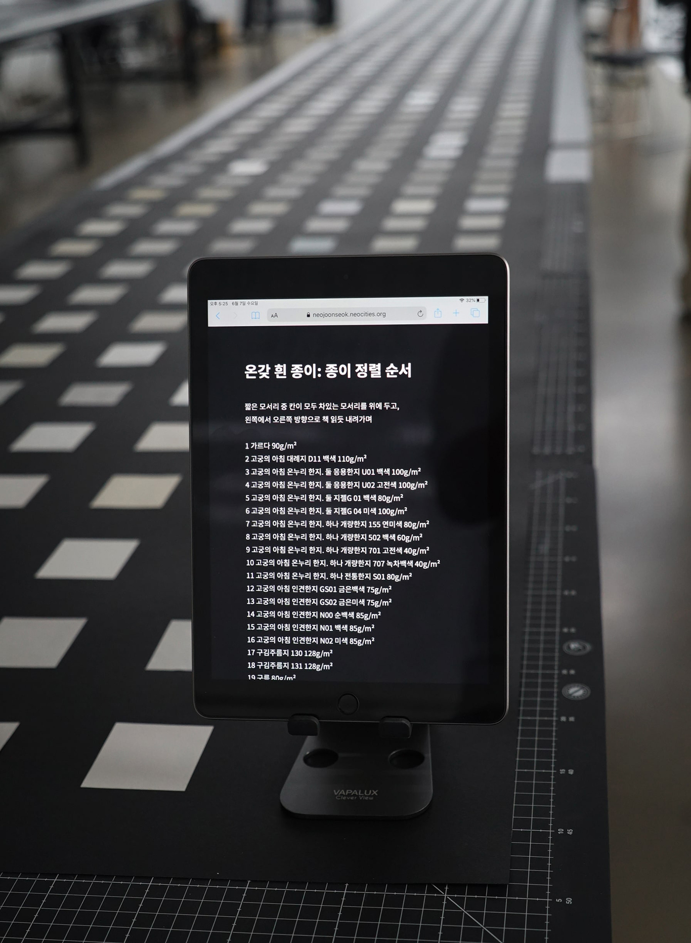 국내 제지회사 6곳에서 수집한 흰 종이 419장을 거듭 분류했다. 처음에는 제지 회사가 규정한 흰 종이와 그 외로 나누었다. 이때 '그 외'에 해당하면서 '흰 종이'보다 더 흰 종이가 존재했고, 이름만으로 분류하는 것은 무의미함을 깨달았다. 하여 이름표를 떼어내고 이름, 두께, 질감, 색상에 따라, 흰색에 가까운 것부터 먼 것까지 스펙트럼으로 분류했다. 그런데 이러면 어떤 종이는 흰 종이이면서 분류하기 애매해지거나 삭제되어야 했다. 내게는 그 종이들도 여전히 흰 종이였고, 마침내 ‘어차피 완벽한 흰 종이는 존재하지 않는다.’라는 결론에 도달했다. 즉 완벽한 흰 종이 같은 건 없으니 이 종이, 저 종이 모두 흰 종이라는 것이다. 자의적 분류의 무의미함을 표현하고자, 엉뚱하게도 수집한 흰 종이들을 ‘가나다 순’으로 정렬해 검은 종이에 붙였다. 이로써 흰 종이에는 서로 위계가 없으며 그 자체로의 속성을 담은 채, 다양하게 존재함을 알린다.