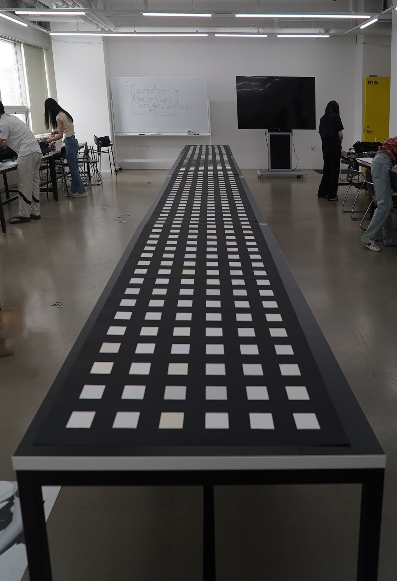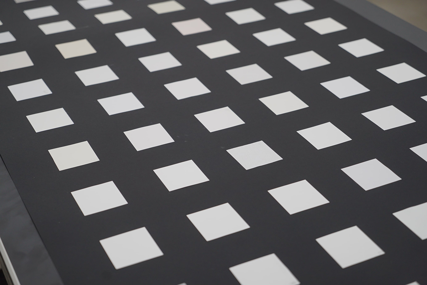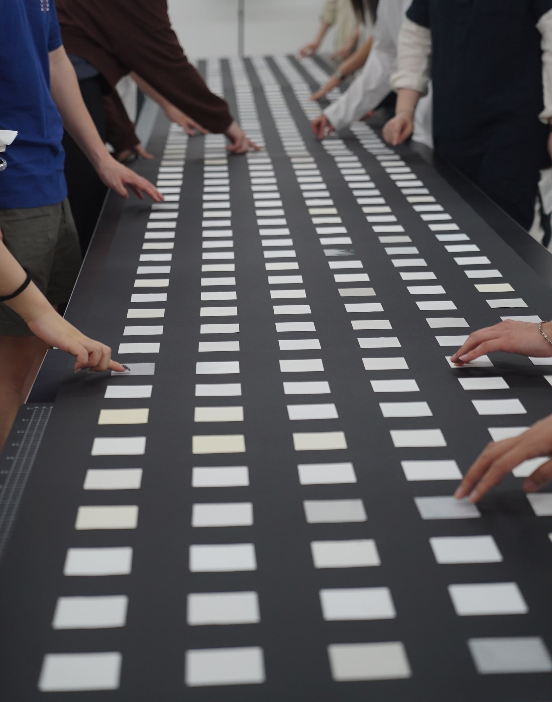 국내 제지회사 6곳에서 수집한 흰 종이 419장을 거듭 분류했다. 처음에는 제지 회사가 규정한 흰 종이와 그 외로 나누었다. 이때 '그 외'에 해당하면서 '흰 종이'보다 더 흰 종이가 존재했고, 이름만으로 분류하는 것은 무의미함을 깨달았다. 하여 이름표를 떼어내고 이름, 두께, 질감, 색상에 따라, 흰색에 가까운 것부터 먼 것까지 스펙트럼으로 분류했다. 그런데 이러면 어떤 종이는 흰 종이이면서 분류하기 애매해지거나 삭제되어야 했다. 내게는 그 종이들도 여전히 흰 종이였고, 마침내 ‘어차피 완벽한 흰 종이는 존재하지 않는다.’라는 결론에 도달했다. 즉 완벽한 흰 종이 같은 건 없으니 이 종이, 저 종이 모두 흰 종이라는 것이다. 자의적 분류의 무의미함을 표현하고자, 엉뚱하게도 수집한 흰 종이들을 ‘가나다 순’으로 정렬해 검은 종이에 붙였다. 이로써 흰 종이에는 서로 위계가 없으며 그 자체로의 속성을 담은 채, 다양하게 존재함을 알린다.