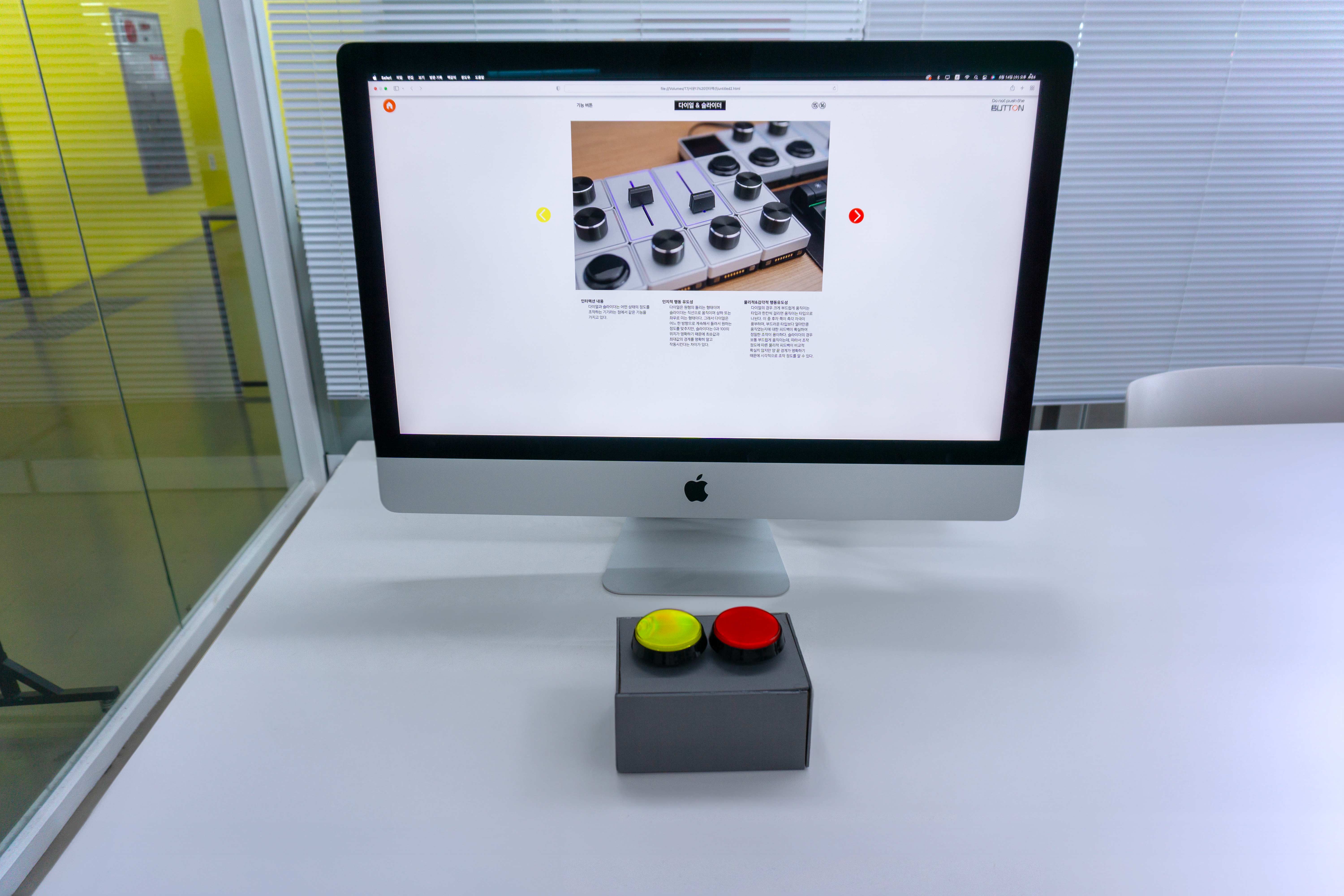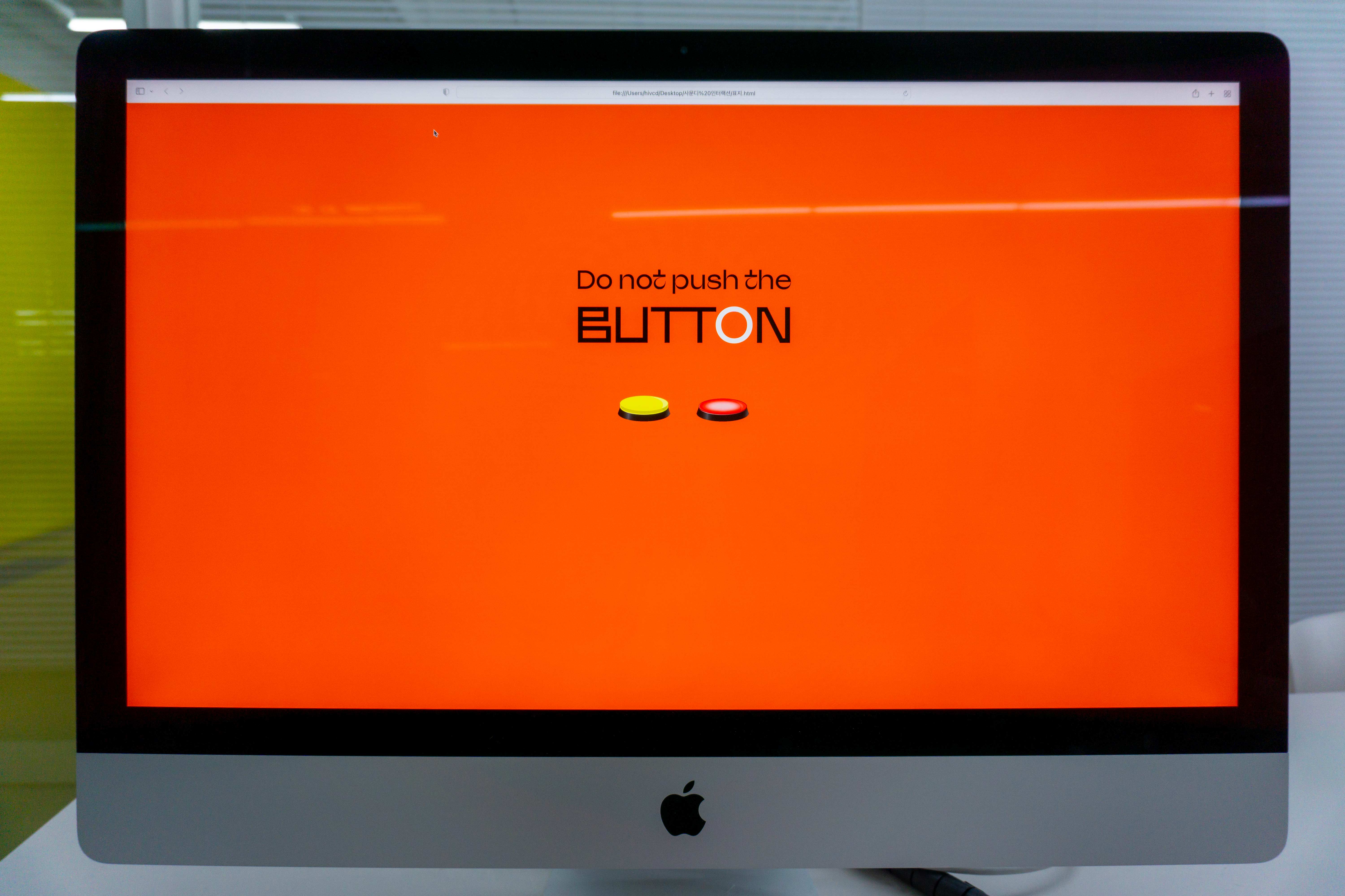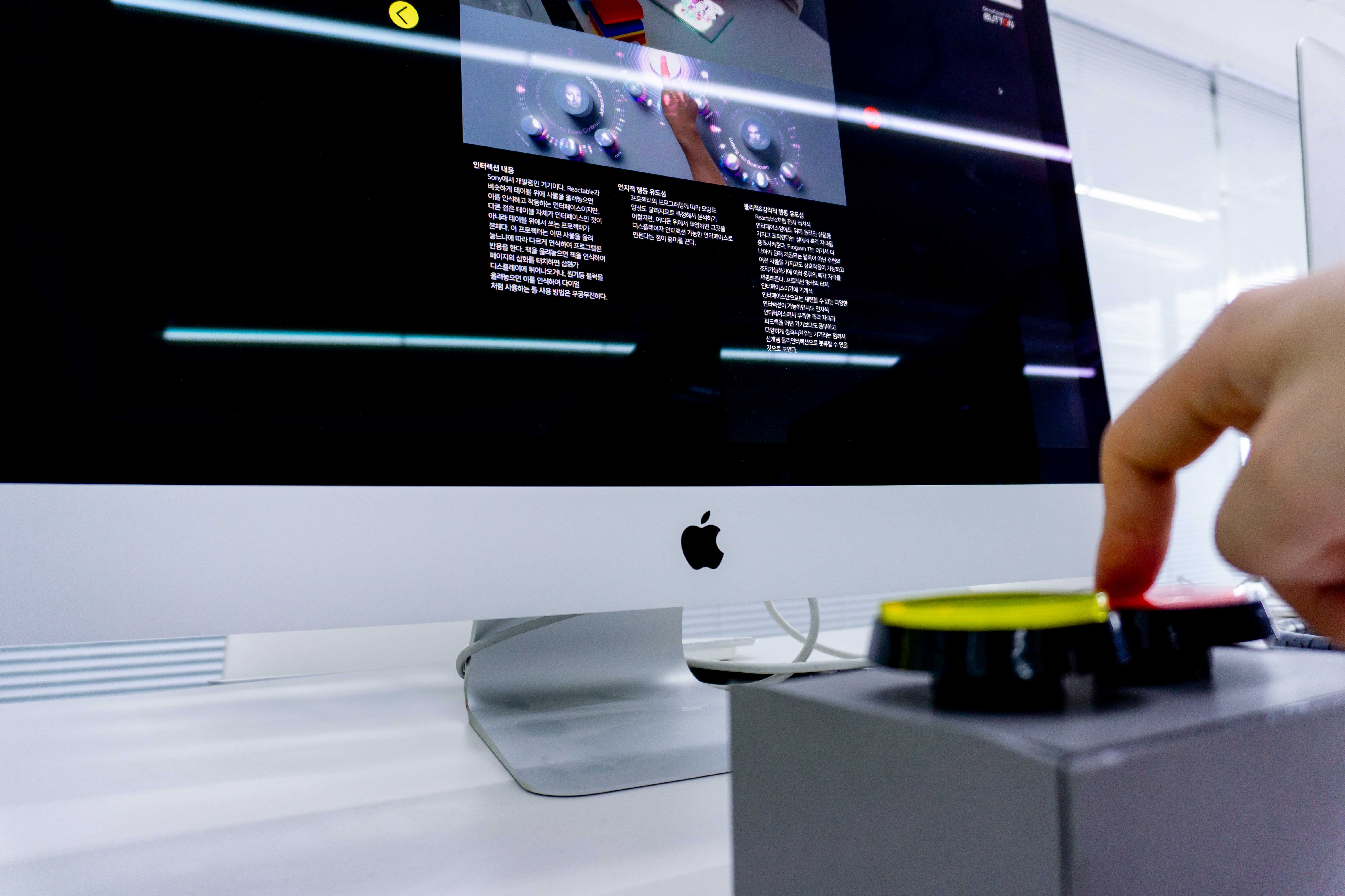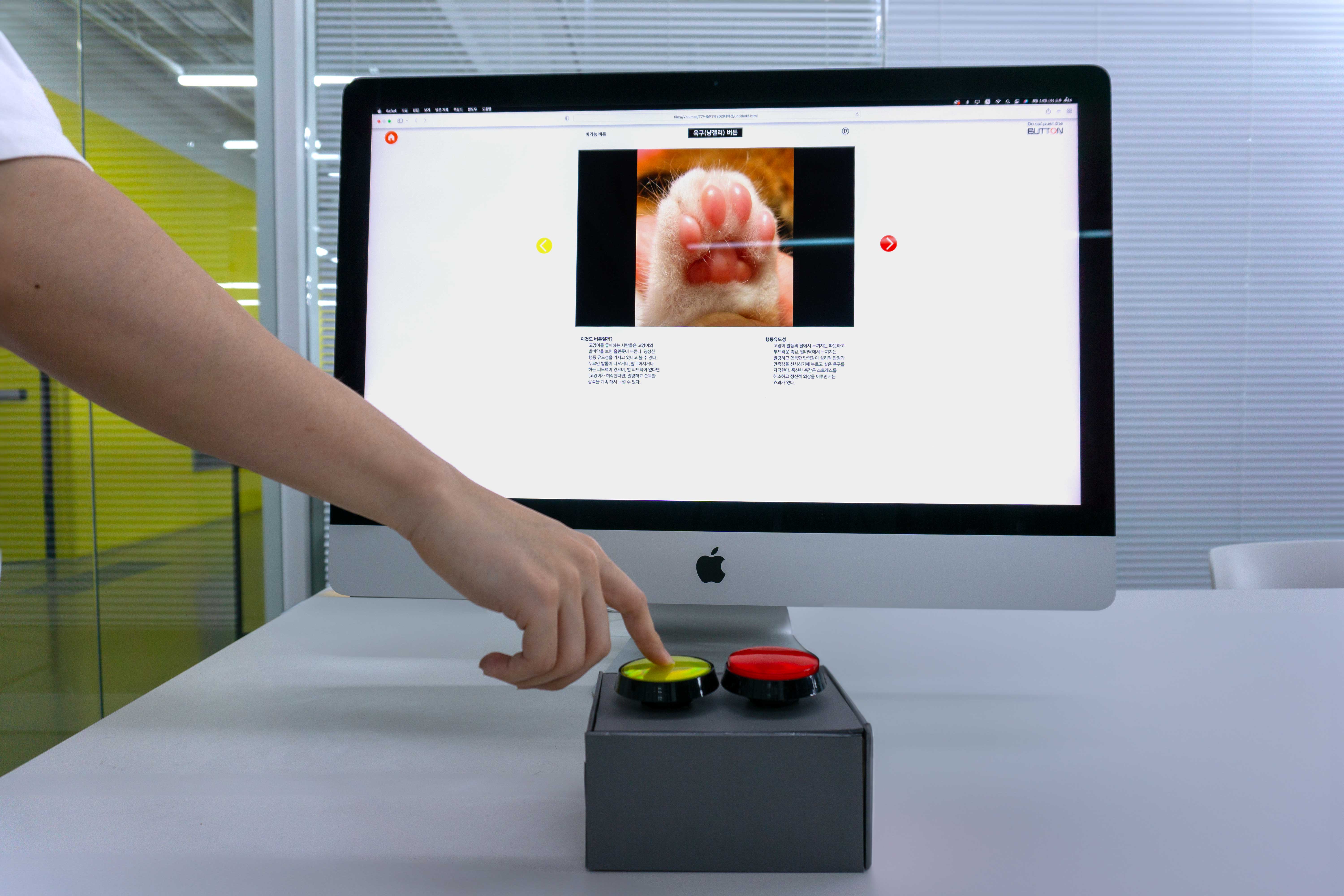 “Do not push the BUTTON”은 동작 인식 기반 인터랙티브 아트에서, 물리 인터랙션의 중요성을 탐구하는 리서치 프로젝트이다. 여기서 물리 인터랙션이란 버튼과 스위치처럼 주로 기계식으로 작동하는, 누르고 돌리고 만지는 등의 동작을 통한 상호작용을 의미하며, 이 프로젝트에서는 그 중에서도 특별히 버튼을 집중적으로 탐구하였다. 모든 곳에 액정과 터치 디스플레이가 사용되는 디지컬 인터페이스의 시대에, 물리적으로 작동하는 아날로그 방식에 가까운 물리 버튼을 주제로 선택한 이유는 이러한 물리 인터페이스가 강한 행동 유도성을 가지고 있기 때문이라고 생각했기 때문이다.