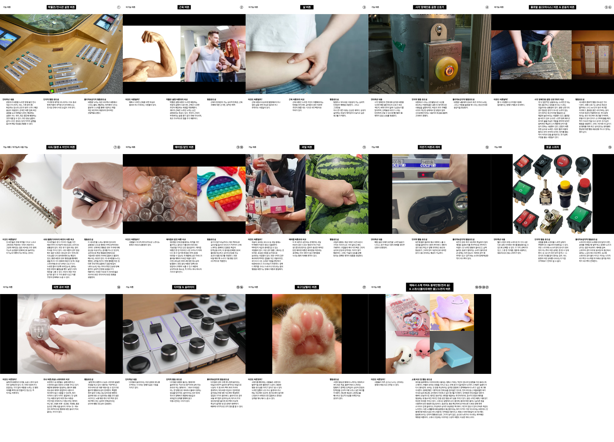 첫 번째는 기능 버튼들에 대한 탐구다. 주로 주변에서 볼 수 있는 기계식 버튼이나 스위치 등을 찾고 이들이 어떤 역할을 하고 있는지, 사람들은 왜 물리 버튼을 누르고자 하는지를 분석하였다.
