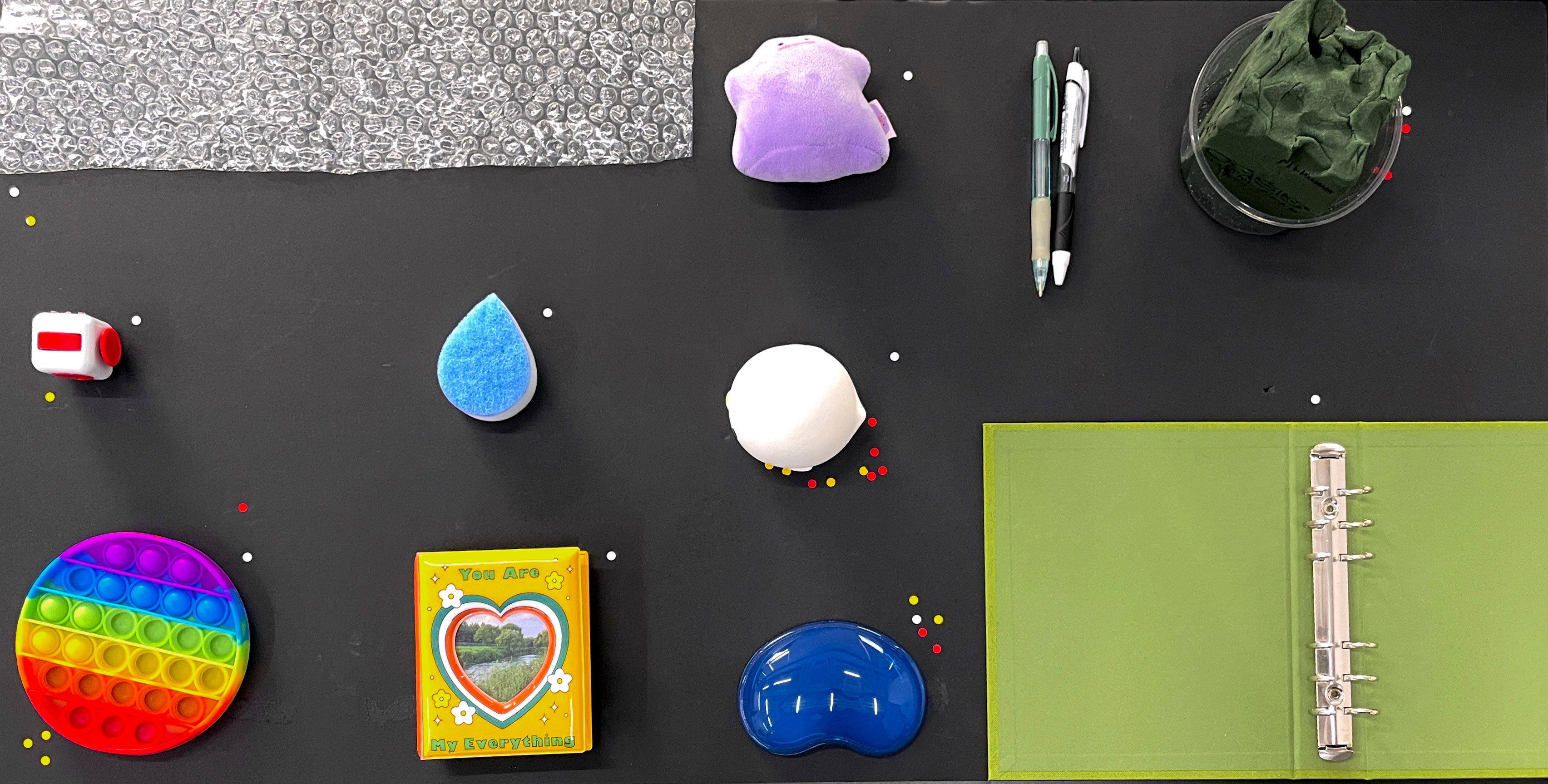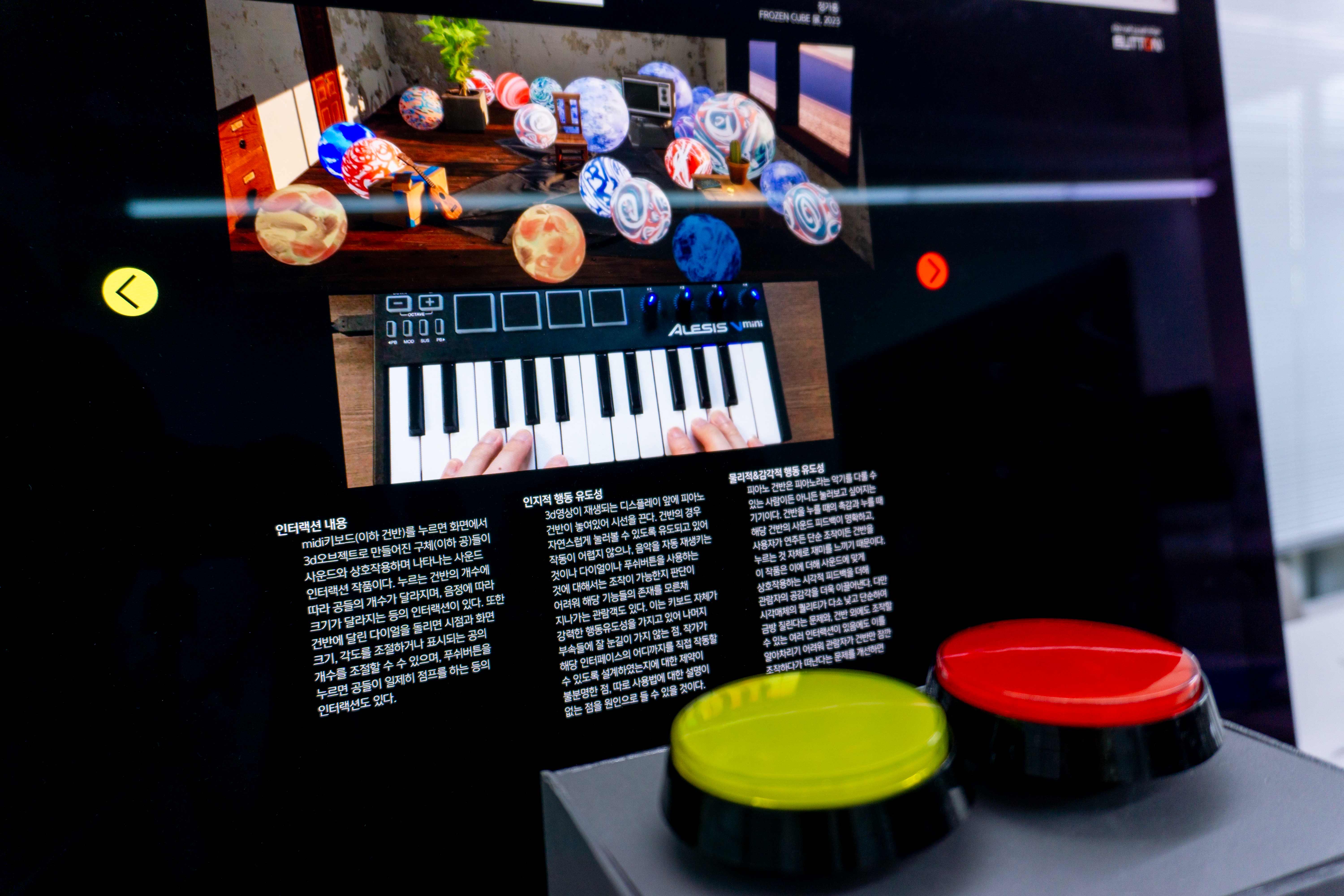 두 번째는 비기능 버튼들에 대한 탐구다. ‘버튼’이라는 개념을 넓게 정의하고, 실제로 버튼은 아니지만 사람들이 마치 버튼처럼 사용하는 것들을 찾았다. 이를 통해 물리 버튼을 누르고 싶어지는 이유 중 하나는 누를 때의 촉감과 딸깍임 그 자체이며, 이는 심리적 만족감과 정서적 안정을 가져다주기 때문임을 보여준다. 여기에서 찾은 비기능 버튼들은 작품과 함께 전시되며, 관람자에게 '가장 누르고 싶어지는 버튼'과 '눌렀을 때 가장 만족스러운 버튼'에 각각 투표하도록 하였다.