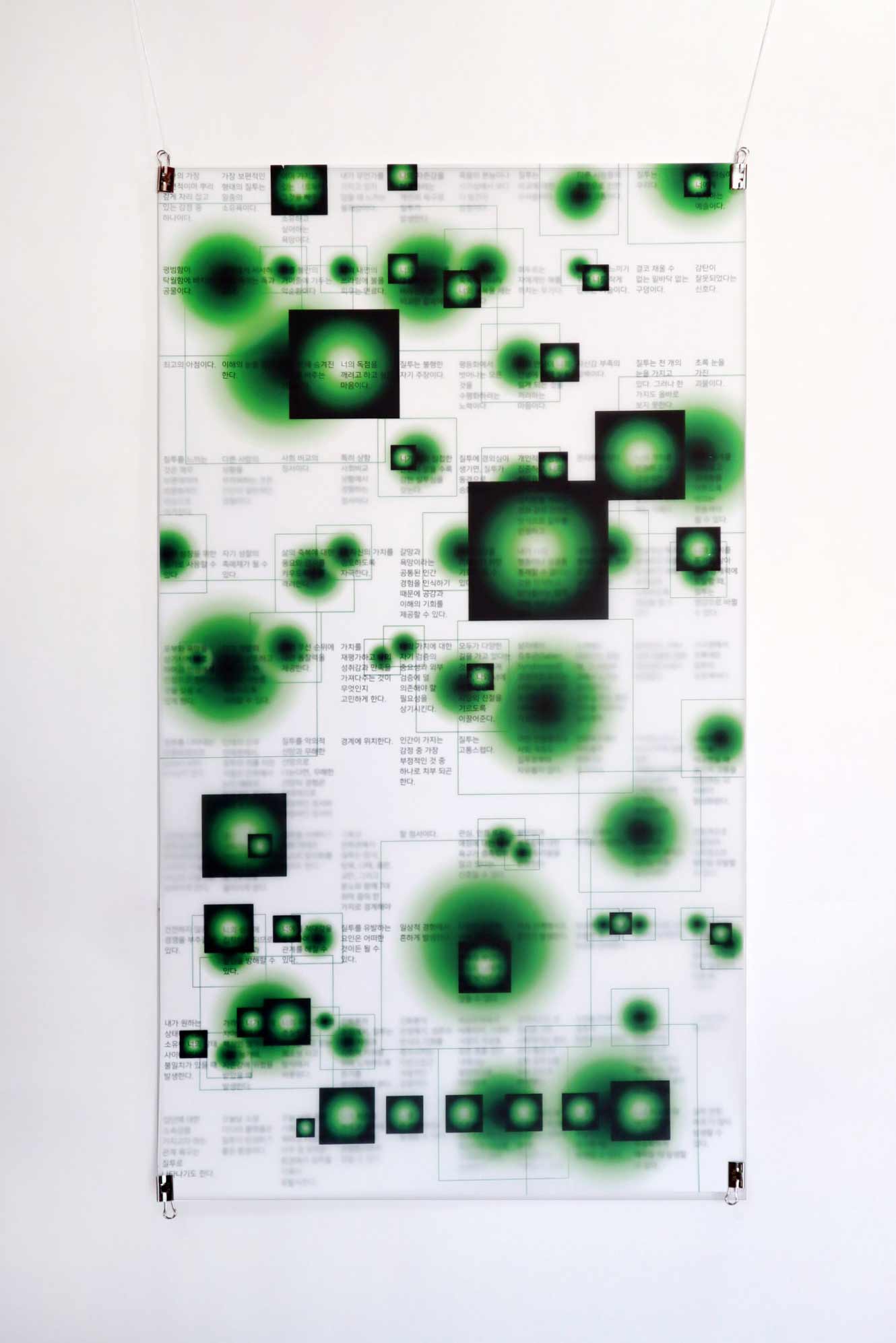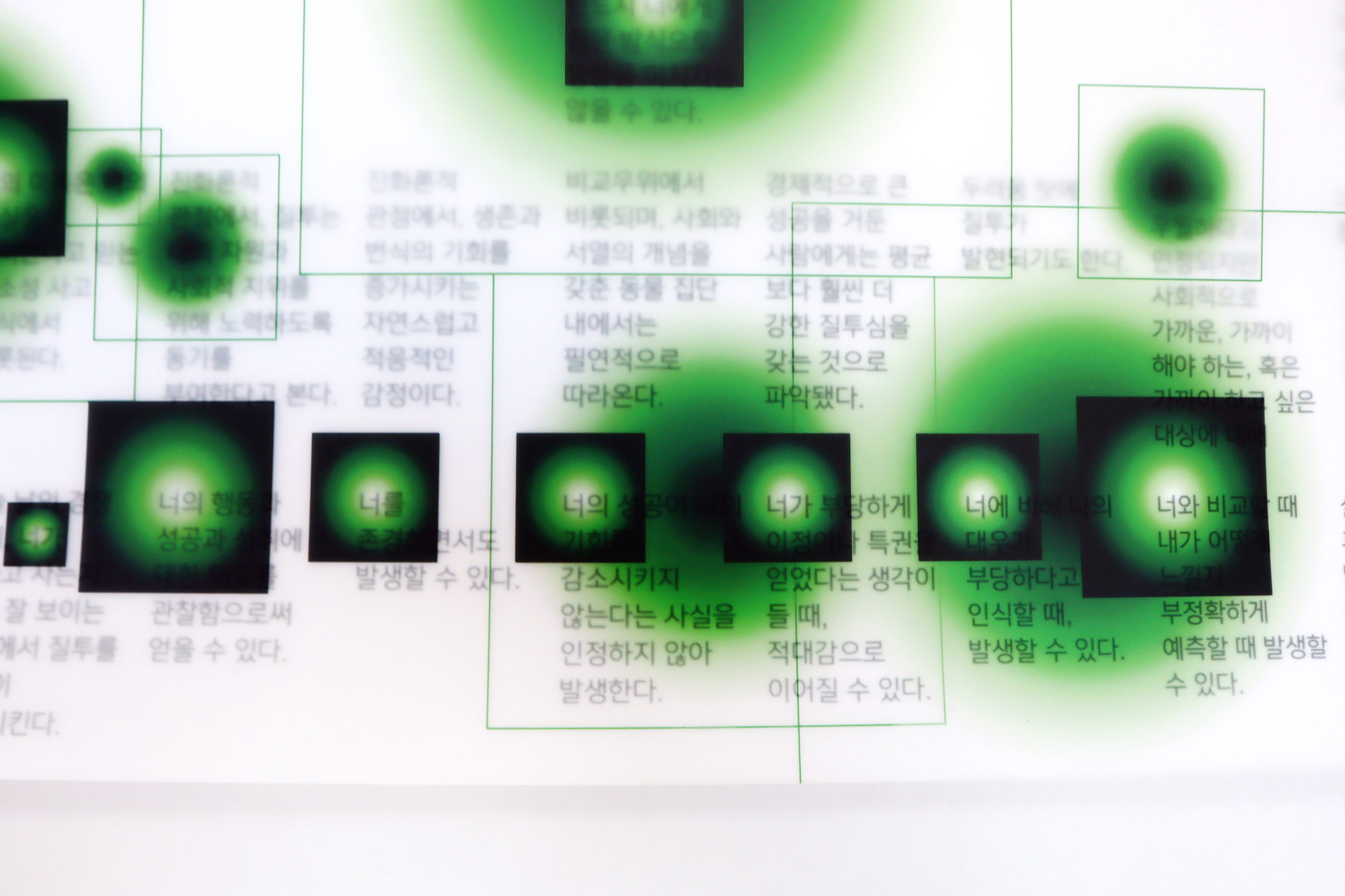 ‘나는 없고, 너는 있다.’는 질투를 시각화한 작업이다. 우리는 우리에게 없는 무언가를 다른 사람들이 가지고 있을 때 질투(부러움)를 느낀다. 즉, 질투는 ‘나’는 없고 ‘너’는 있음으로써 느껴지는 감정이다. 오늘날, 편집되고 가공된 타인의 정보에 노출되기 쉬운 환경에서는 나에게 없는 것과 너에게 있는 것의 비교가 극대화된다. 그리고 그러한 비교가 만나는 지점에서 질투가 발생한다. 수집한 문장들은 질투에 대한 여러 가지 관점, 정의, 특징에 대한 문장이며 우리, 자신 등의 일인칭 단어를 ‘나’로 타인, 상대방 등의 이인칭 단어를 ‘너’로 바꾸어 재편집했다. 각 문장 속 ‘나’와 ’너’를 찾아 각각의 그래픽의 중심에 위치시켰고, 가리거나 강조하는 방식으로 그래픽을 배치하여 ‘나는 없고, 너는 있음’을 시각화했다. 그래픽의 형태는 편집되고 가공되어 올라오는 플랫폼 속 이미지의 여러 가지 판형 중 1:1인 정사각형을 따랐다.
