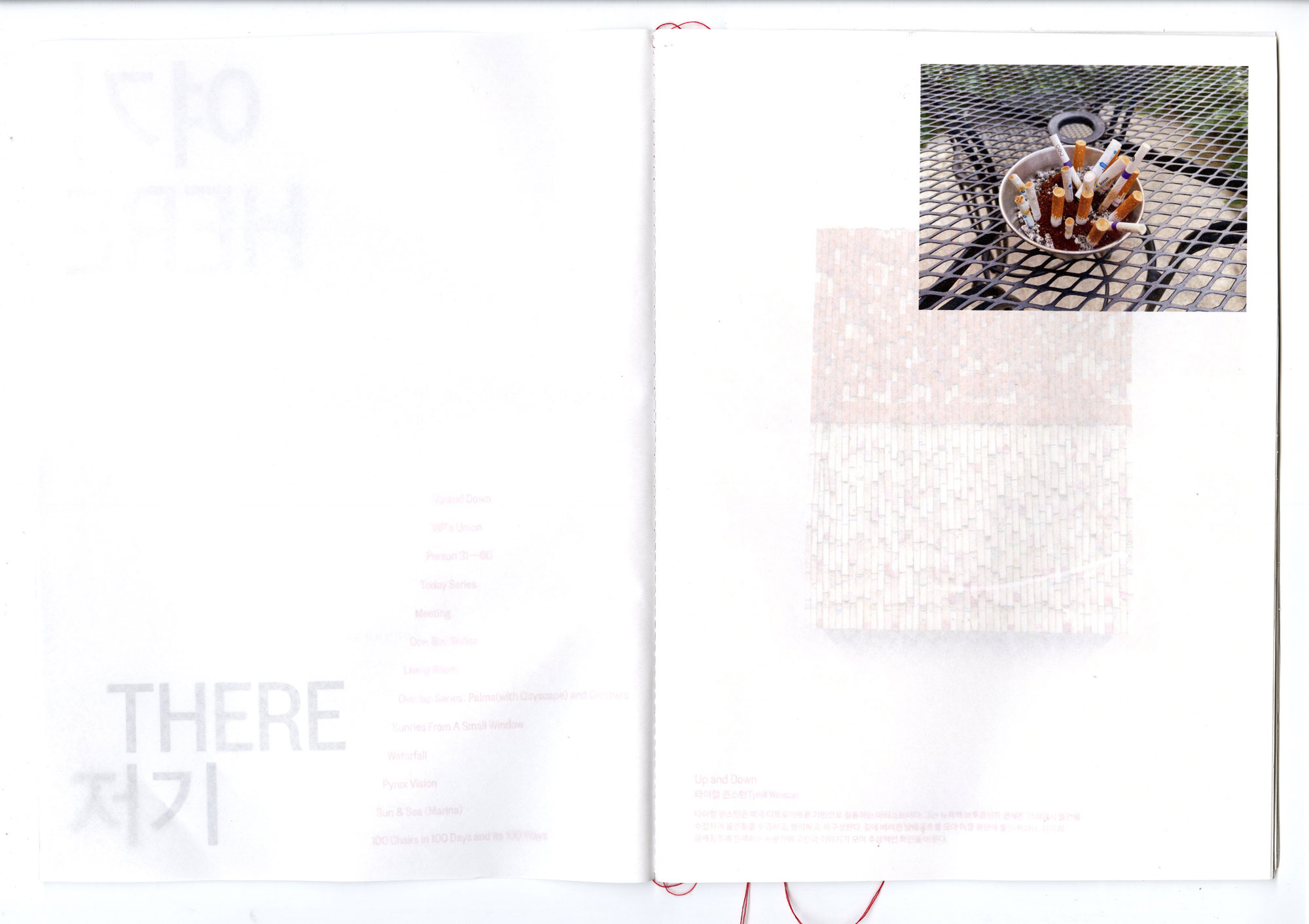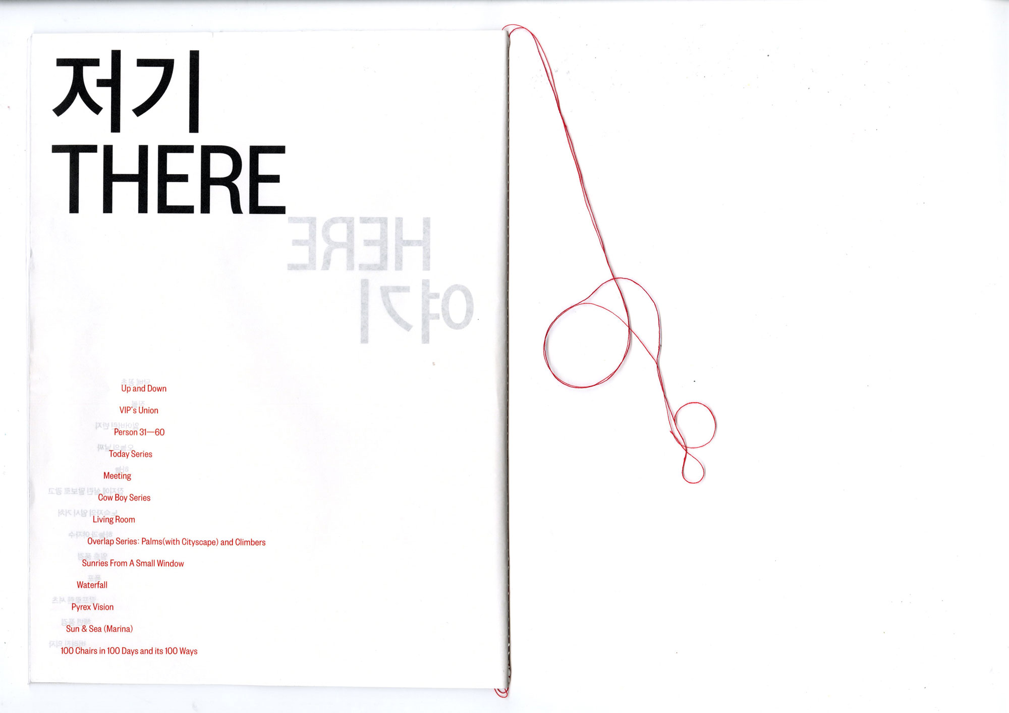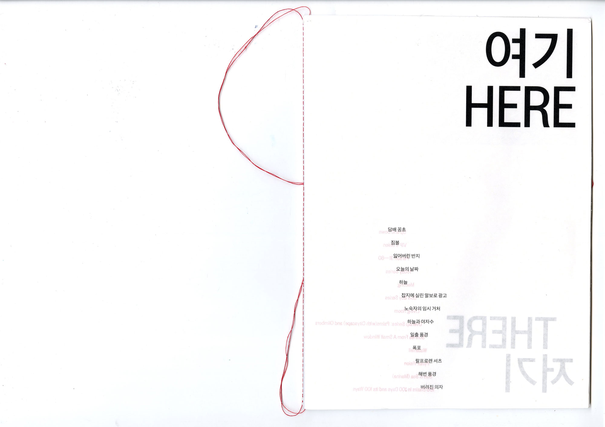 〈여기저기〉는 박산하가 일상에서 포착한 사진을 '여기'로, 그것이 공공의 예술 작품이 된 사례를 '저기'로 소개하는 책이다. '여기'와 '저기'라는, 나를 중심으로 한 공간의 논리를 일상의 사물을 예술로 만들어낸 사례를 살피는 시각으로 바라본다. 독자는 신체에서 가까운 쪽에서 더 먼쪽으로 페이지를 넘기며 여기와 저기의 감각을 탐색한다. 계속해서 뒷면이 비치는 책의 구성은 관객이 여기와 저기를 관통해서 볼 수 있도록 하며, 여기와 저기 사이 명확한 경계가 있지 않음을 은유한다. 이를 통해 여기와 저기의 차이를 만드는 것은 무엇일지에 대한 질문을 던진다.