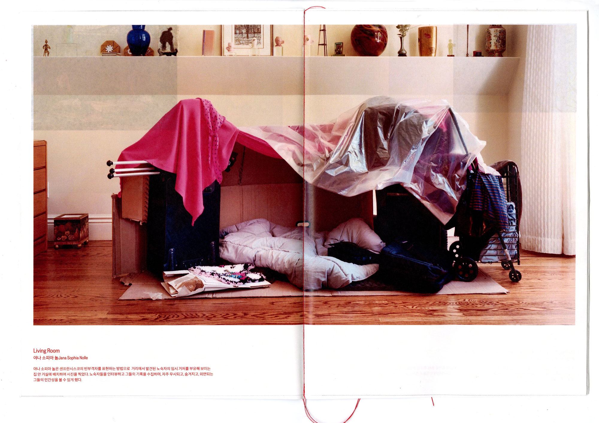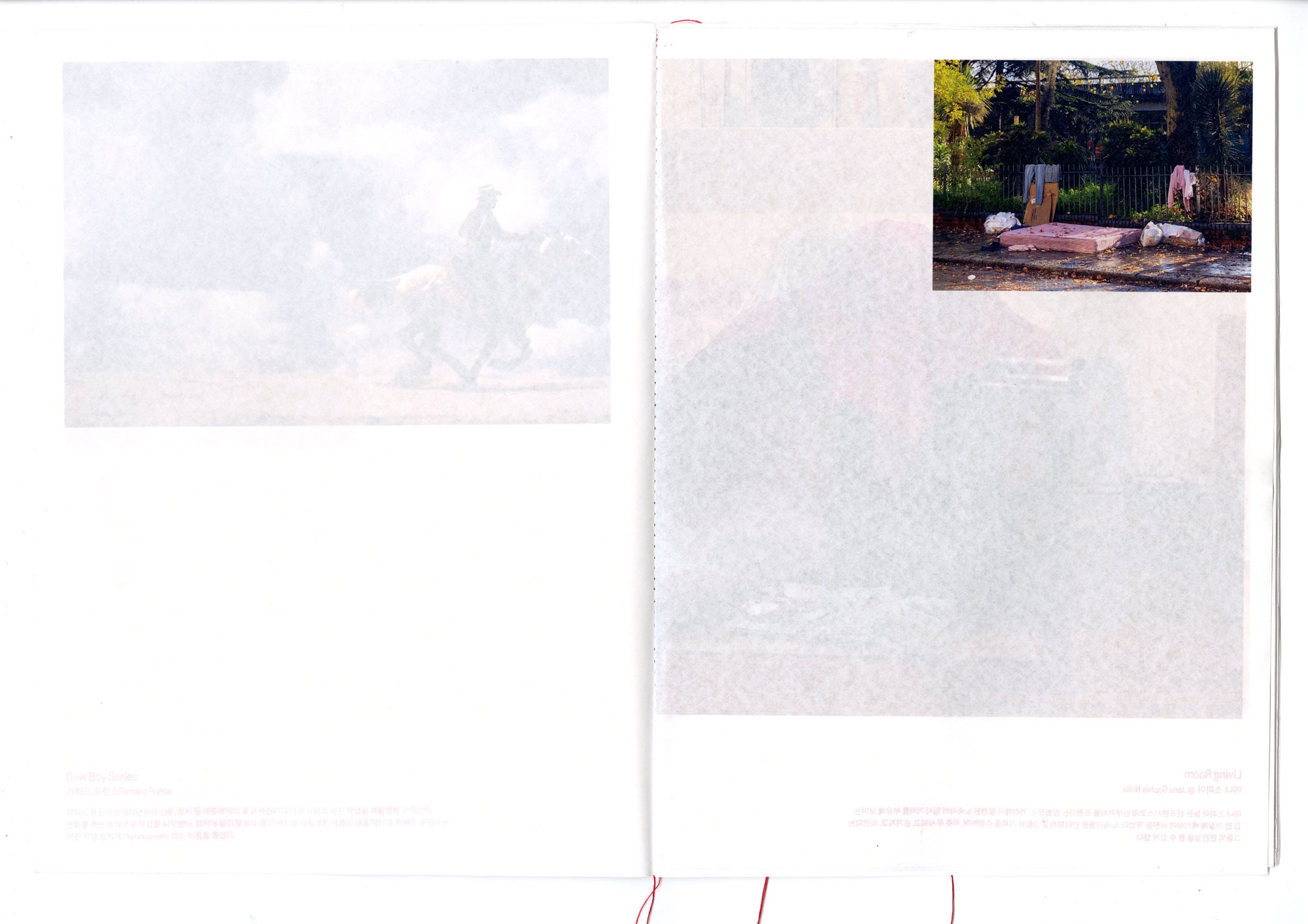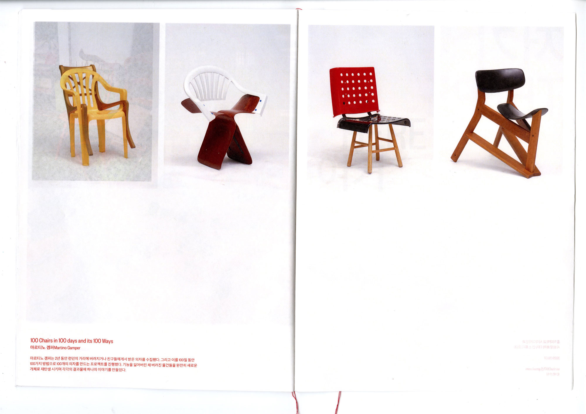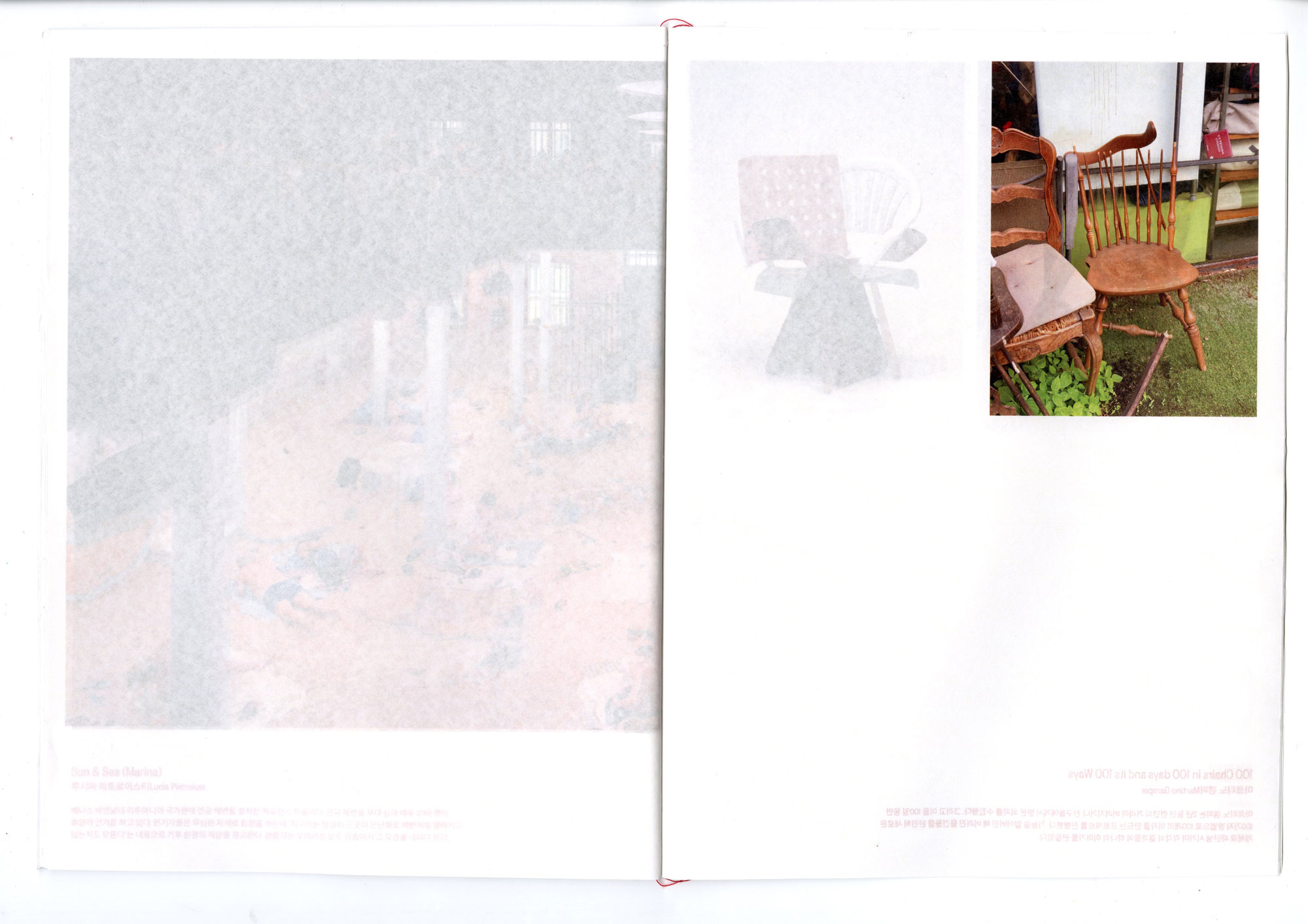 〈여기저기〉는 박산하가 일상에서 포착한 사진을 '여기'로, 그것이 공공의 예술 작품이 된 사례를 '저기'로 소개하는 책이다. '여기'와 '저기'라는, 나를 중심으로 한 공간의 논리를 일상의 사물을 예술로 만들어낸 사례를 살피는 시각으로 바라본다. 독자는 신체에서 가까운 쪽에서 더 먼쪽으로 페이지를 넘기며 여기와 저기의 감각을 탐색한다. 계속해서 뒷면이 비치는 책의 구성은 관객이 여기와 저기를 관통해서 볼 수 있도록 하며, 여기와 저기 사이 명확한 경계가 있지 않음을 은유한다. 이를 통해 여기와 저기의 차이를 만드는 것은 무엇일지에 대한 질문을 던진다.