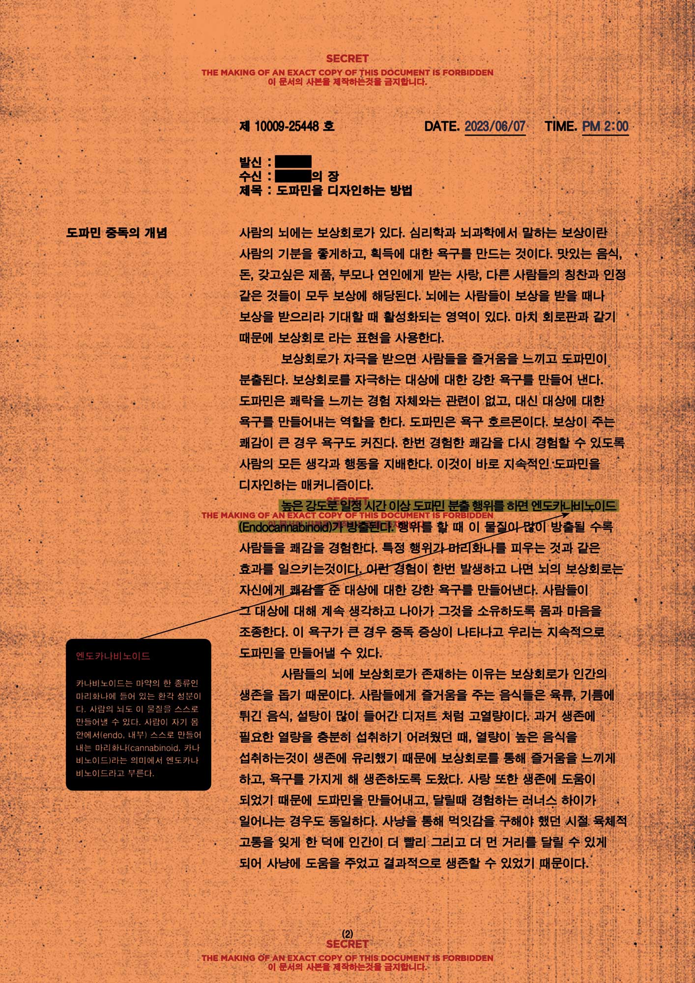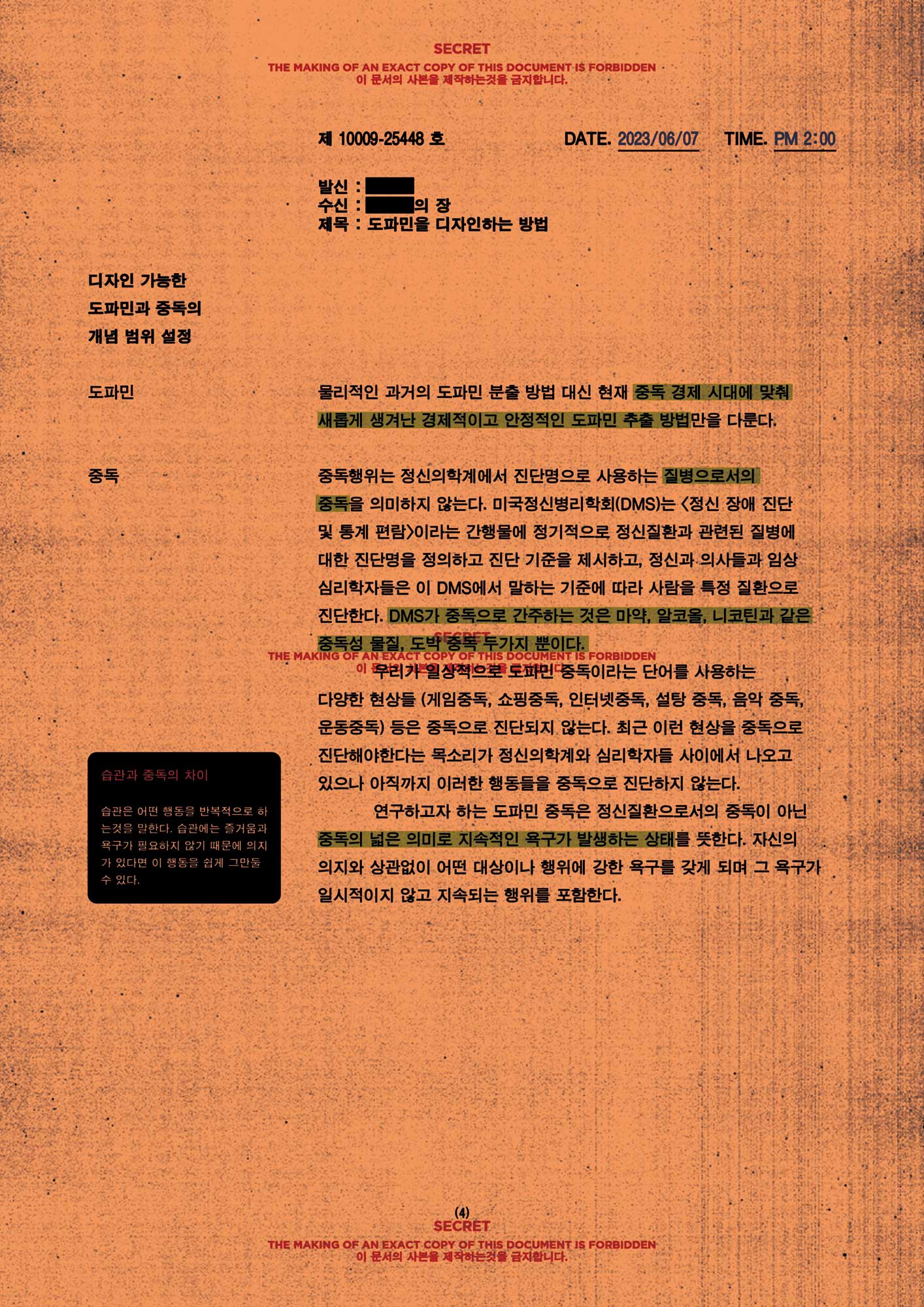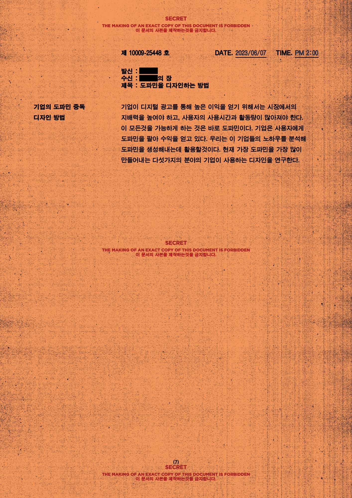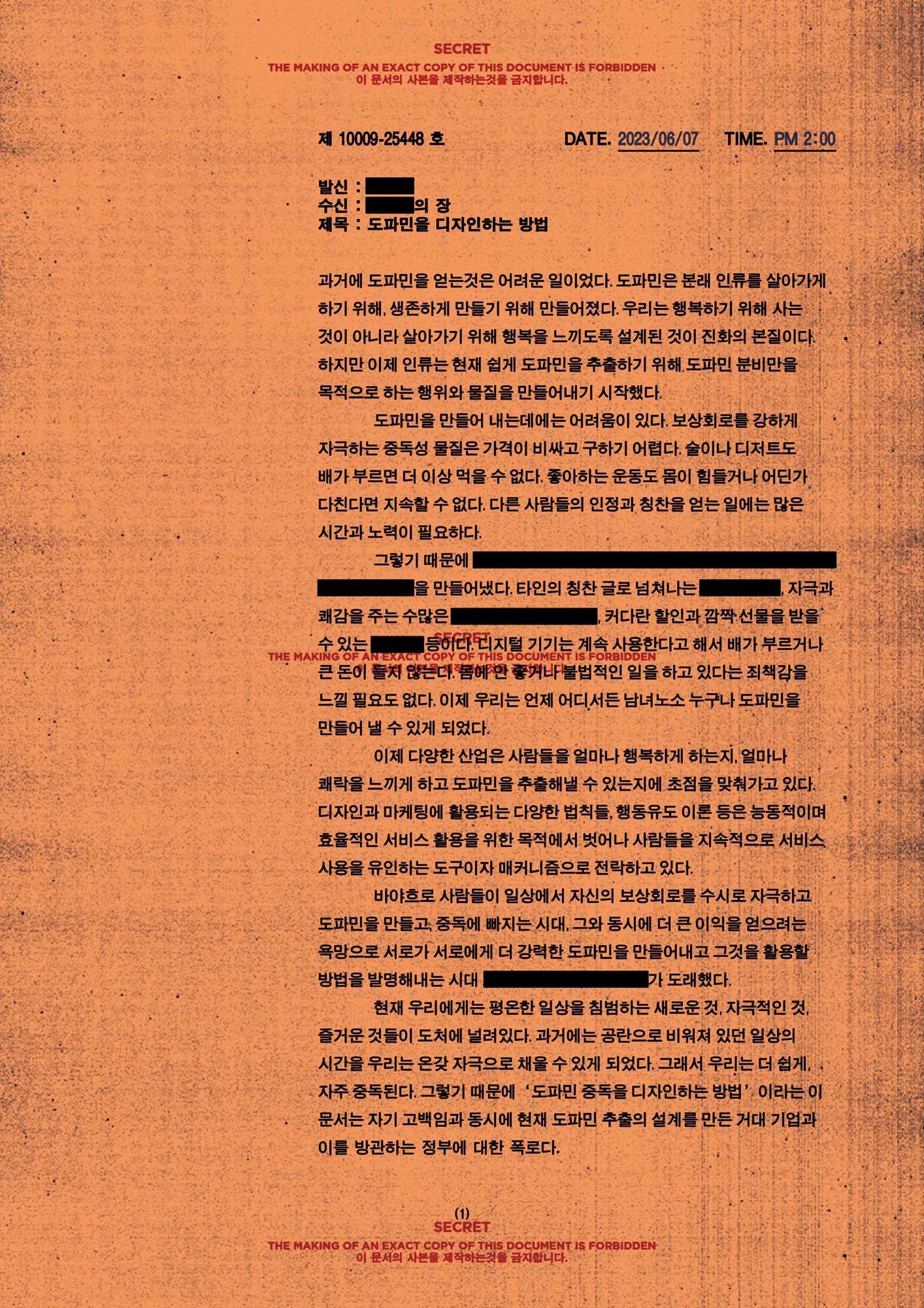 <도파민 중독을 디자인하는 방법>은 현대인들에게서 도파민을 추출하는 방법을 정리한 25페이지 가량의 문서다. 이 문서는 기밀문서로 한 연구자에 의해 작성되어 고위 관리자에게까지 전달된 것으로 보인다. 하지만 문서가 거대 기업들을 겨냥하고 있어 유출될 시 국제 경제에 악영향을 미칠 것을 고려해 공개하지 않았을 것이라 추측한다. 우리가 확인할 수 있는 현재 문서는 원본에서 발신인과 수신인 직접적인 산업군과 기업명이 모두 삭제된 카피 문서뿐이며 이 문서를 유출한 제보자 또한 누구인지 알 수 없다. 그리고 이 문서의 사실관계 여부는 정부와 국제기관 그 어디에서도 인정하지 않고 있다.